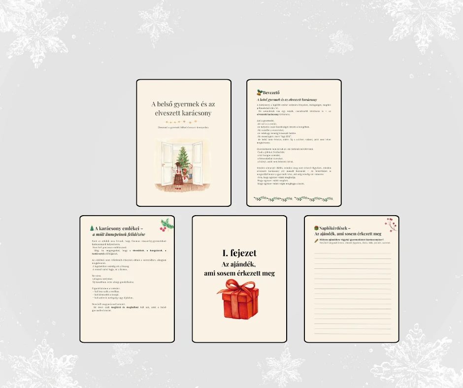 A karácsony sokak számára nemcsak az ünnep fényéről szól, hanem azokról a csendes hiányokról is, amelyek gyermekként kimondatlanul bennünk maradtak. Ez a munkafüzet azoknak készült, akik érzik: a múlt karácsonyai még mindig ott élnek a lelkükben — és ideje megérteni, átölelni és begyógyítani őket.